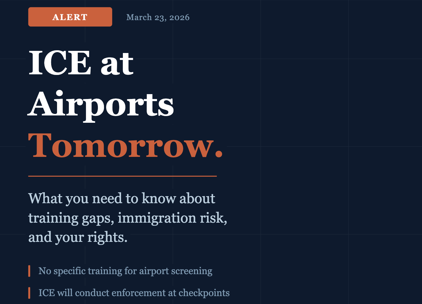 Even for those with lawful status, the expansion of ICE's visible role in a space as unavoidable as an airport creates real anxiety. Documents can be questioned. Status can be challenged. In a climate where enforcement has been aggressive and errors in the field have already occurred, the stakes of being stopped by an agent who lacks specific training, in a high-pressure environment, are not trivial.